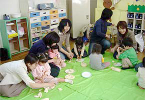小麦粉粘土の感触を楽しみながら、思い思いに作っています。お母さんも、大喜び!